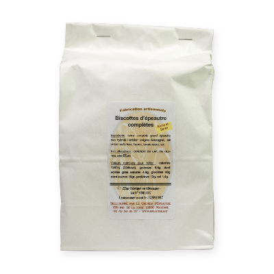 Ces biscottes d’épeautre* complet présentent une texture sèche et friable obtenue après une double cuisson. Tranchées puis grillées, elles offrent une tenue croustillante et un goût équilibré, fidèle à une recette traditionnelle.