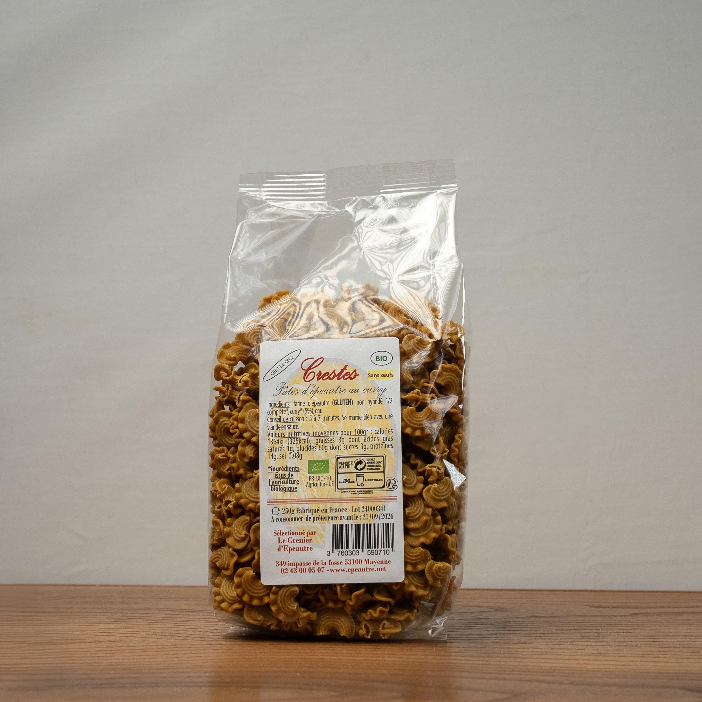 Ces pâtes associent la farine de épeautre* et le curry pour proposer une recette équilibrée et parfumée. Leur forme crêtes de coq permet une bonne tenue à la cuisson et une association facile avec des plats en sauce.