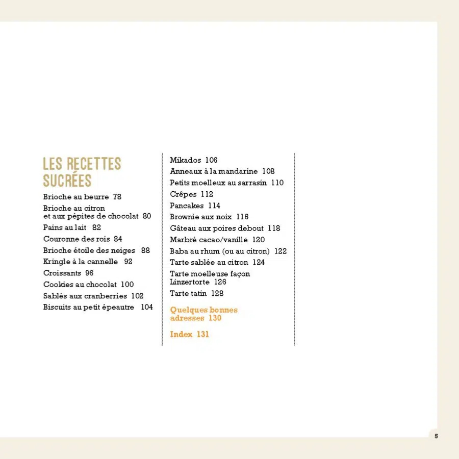 Elle y propose également une quarantaine de délicieuses recettes salées et sucrées, originales, inattendues et novatrices, à IG bas ou modéré grâce à l’utilisation de farines non raffinées et de sucres « alternatifs ». Vous pourrez ainsi réaliser baguettepain de miepains à hamburger, à pizzagressins et pâtes fraîches, mais aussi briochepains au laitcouronne des roiscroissantsmikadosmarbré cacao/ vanille ou encore tarte moelleuse façon Linzertorte.