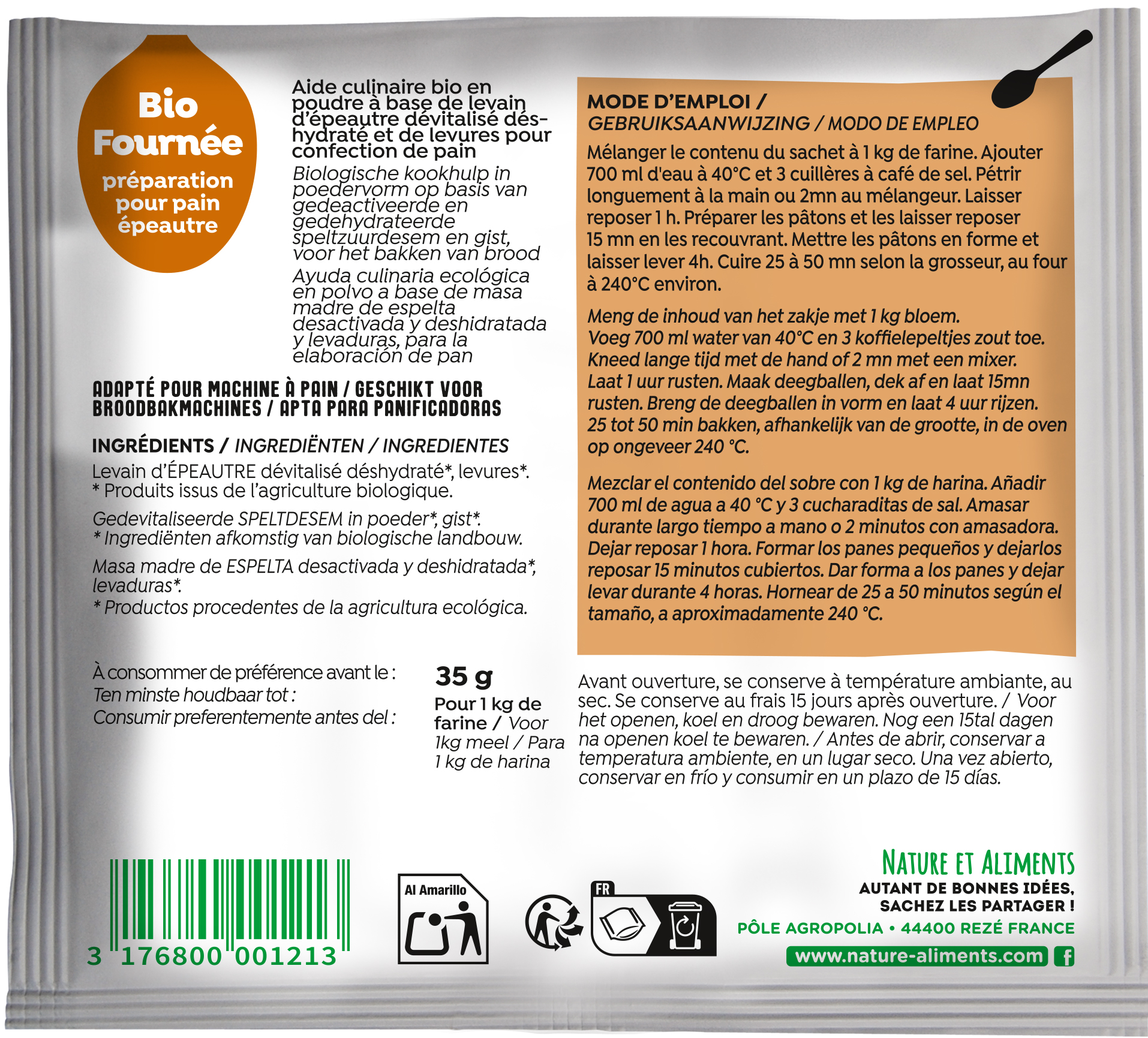La préparation à base de levain d’épeautre* est un mélange de levain dévitalisé et de levures, conçu pour la réalisation de pâtes à pain.