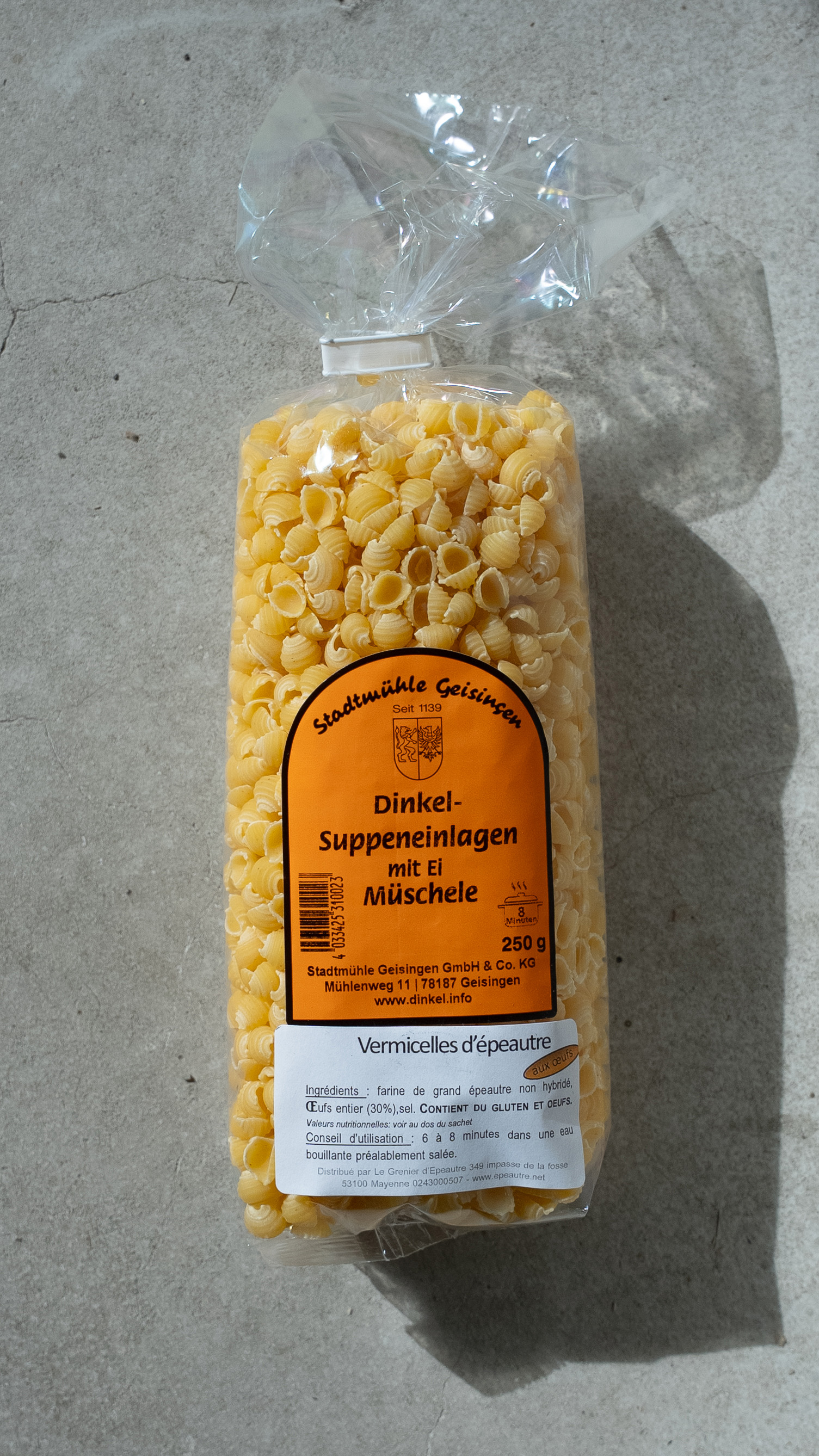 Ces petites pâtes en forme de coquillage apportent une texture délicate idéale pour accompagner vos soupes claires ou vos bouillons. Leur douceur et leur finesse permettent d’obtenir une préparation légère et agréable, tout en profitant de la saveur caractéristique de l’épeautre*.